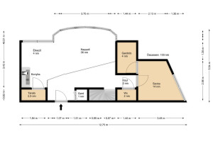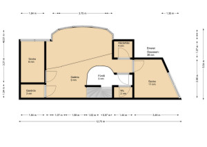 Felső szint: két hálószoba, fürdőszoba, galéria, háztartási helyiség és gardrób.